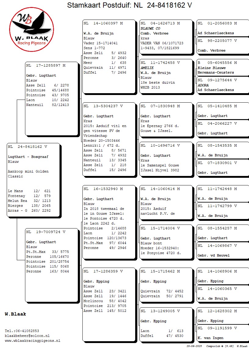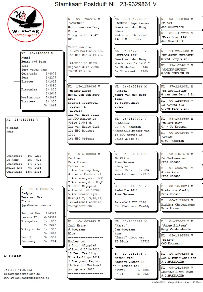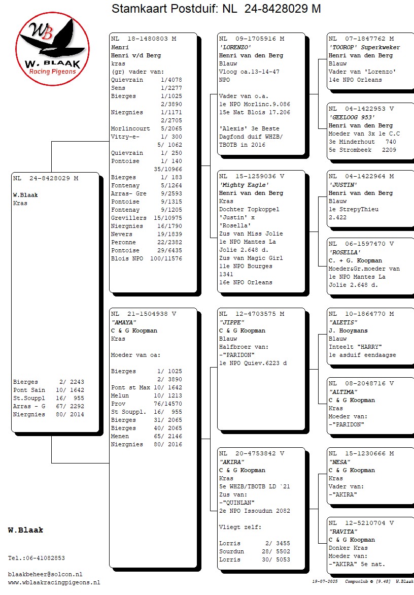 Over de vlucht kan ik kort zijn. Ik begrijp de beslissing om ze eruit te gooien, maar als je het filmpje van de lossing ziet en je hoort dat honderden (zo niet duizenden) duiven 20 minuten later nog op de losplek hingen dan weet je wat er gaat volgen. Dan moet je hele goede hebben, of duiven in topvorm om mee te doen. Beide heb ik niet dus ik begin, ten opzichte van de nationale top 10 die toch aan onze kant zat (lees bij onze Zeeuwse vrinden), 45 minuten te laat. Op het moment van schrijven heb ik er 25/26 thuis (om 22.00 valt nog 1 van mijn betere duivinnen). Wat dat betreft allemaal niet dramatisch maar ik heb een hok vol thuiskomers maar geen kopvliegers. Ik kan nu 2 dingen doen, accepteren zoals het is en relaxte duivensport gaan beleven of een afspraak plannen met Ben de K. Nou het laatste heb ik gedaan, woensdag 10:00 uur ga ik een bakkie bij hem doen en die kromsnavels van gebak voorzien. Om de duiven toch de eer te geven die ze verdienen, hier de eerste 4 (omdat deze 1:4 prijs vlogen in de Krimpenerwaard pfft)