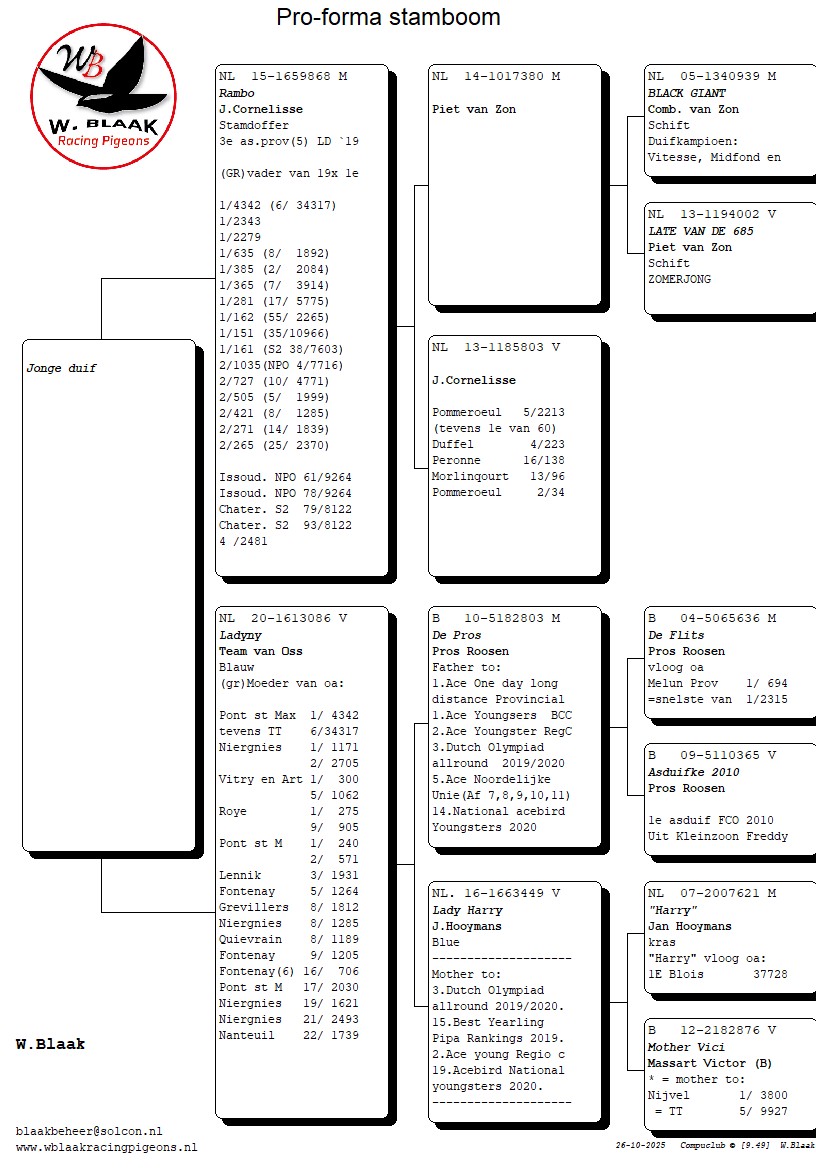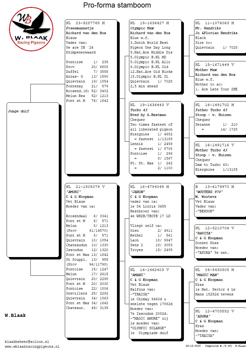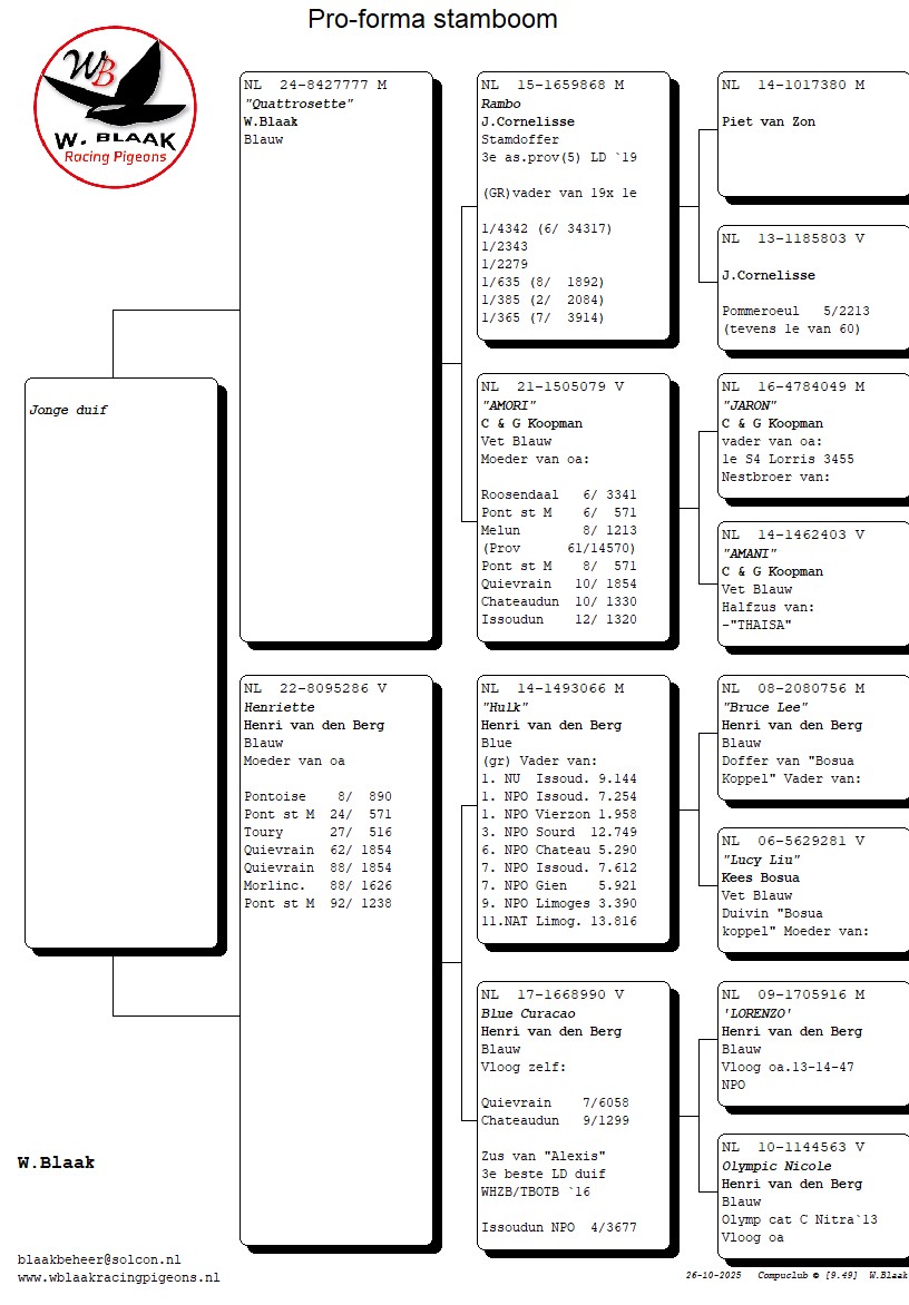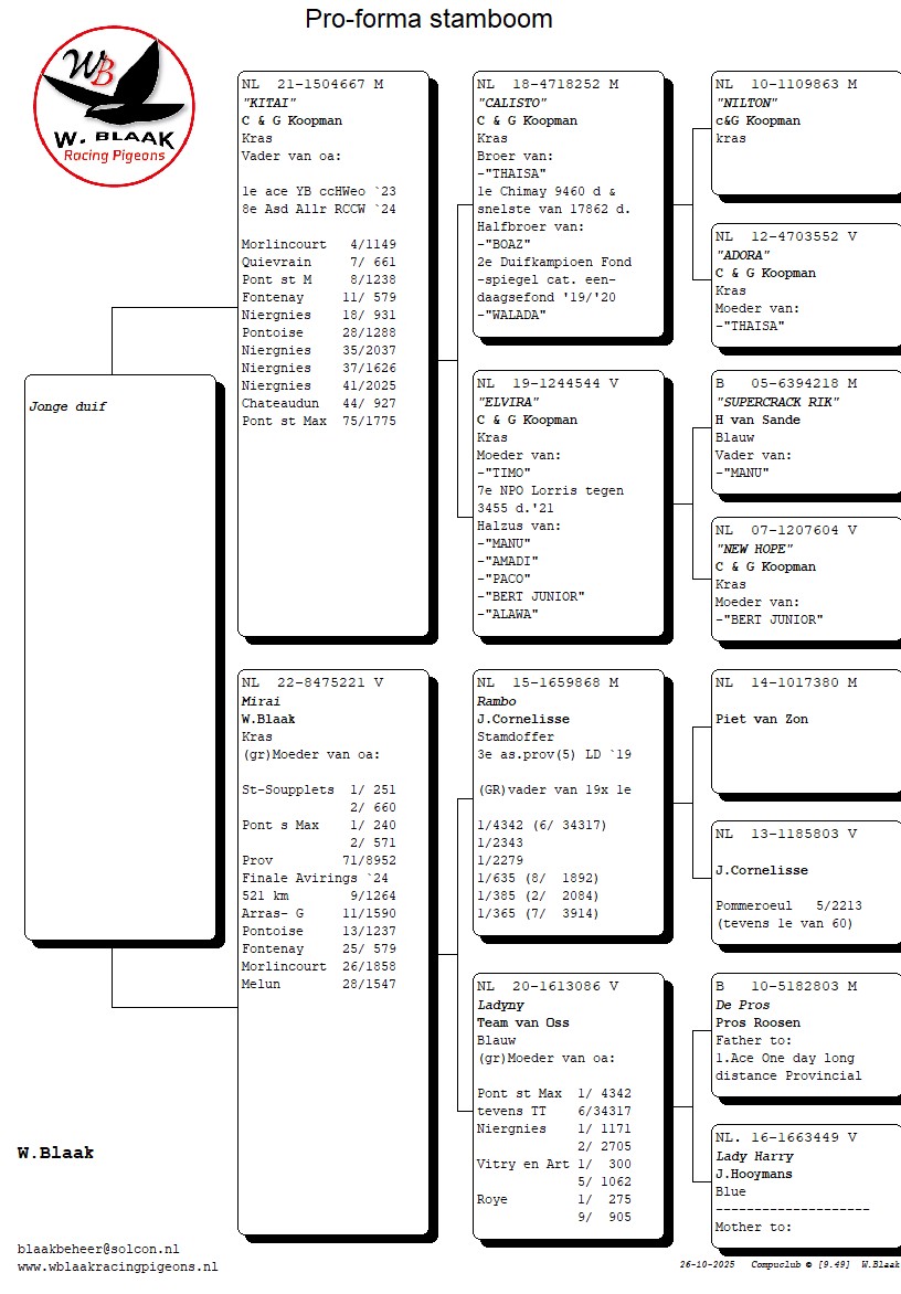 Koppels Koppel 1 Dit zijn de voorlopige koppelingen voor ronde 1 en 2 2025/2026 Rambo x Ladiny Koppel 2 Zoon "Ruth" x Kleindochter "Rambo" Koppel 3 Henri x Miya Koppel 4 Kawai x Ricarda Koppel 5 Thijmen x Patricks Choice Koppel 6 Kyodai x Amaya Koppel 7 Patricks Promise x Nibali`s Girl Koppel 8 Ikemen x zus "Olympic Yoni" Koppel 9 Jordi x dochter "Rambo" Koppel 10 Family Man x Marsmannetje Koppel 11 Zenn x Rik`s Favorite Koppel 12 Preesmannetje x Amori Koppel 13 Quattrosette x Henriette Koppel 14 Pepijn x Bente Koppel 15 Kitai x Mirai Koppel 16 Bont Baasje x Ann Mary