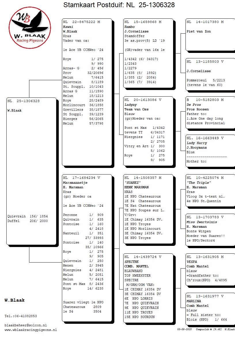 Het werd helaas weer een uitgestelde vlucht, logisch gezien het herfstweer van zaterdag. Zondag was het zeker `s ochtends stralend weer en zowel de jongen als de oude gingen er mooi op tijd uit. Helaas niet met een NW maar een behoorlijk harde WZW wind. Omdat ik vorige week toch wel verrast werd met een minder gunstige wind stond ik toch wel met gespannen verwachting op de jongen te wachten. Gezien de meldingen wist ik dat 1700 meter mogelijk moest zijn, maar dan zit ik aan mijn kant vaak ergens tussen de 1650-1670. Op 9.52 zie ik de eerste duiven overkomen die idd rond de 1700 maken, op `54 komt iets teveel uit het westen!? een duif voor mij aan die niet treuzelt en direct op de plank valt. Net geen 1662 meter lees ik af en dat voldoet dus aan de verwachtingen, niet laat maar ook niet echt vroeg. Op dat moment hangen er al weer 2 boven het hok die binnen een halve minuut op de plank vallen, waarna er binnen een minuut weer 1 valt. Dan valt er een (te groot) gaatje waarna de duiven gestaag doorvallen. Nadat de helft van de jongen gevallen is ga ik eens op live kijken om de schade op te nemen. Tot mijn verbazing zitten de eerste 3 duiven er gewoon heel goed bij, zelfs tov de achterhand die met deze wind veel harder zou moeten pakken. Overigens klopt er weer weinig van de meldingen, want er ontbreken diverse namen en de meters bij andere liefhebbers kloppen niet, wat een ergernis is dat toch. Wat heb je dan aan melden? Als de uitslag er is blijkt het een 11,13 en 14 tegen 1590 duiven te zijn geworden en 26/51 erin 1:4, 32/51 erin 1:3. Das dus prima. Wie het weet mag het zeggen, maar waar de grootmeesters uit Reeuwijk er vorige week maar 10 voor me hadden is dat er nu maar 1 (ook al zijn er verzachtende omstandigheden aan te voeren) Dit plezier was overigens maar van korte duur maar daar over straks meer. Op het moment van schrijven nog 1 strijder onderweg, dit waren de eerste 3: (nummer 1 en 3 zijn neef en nicht overigens)